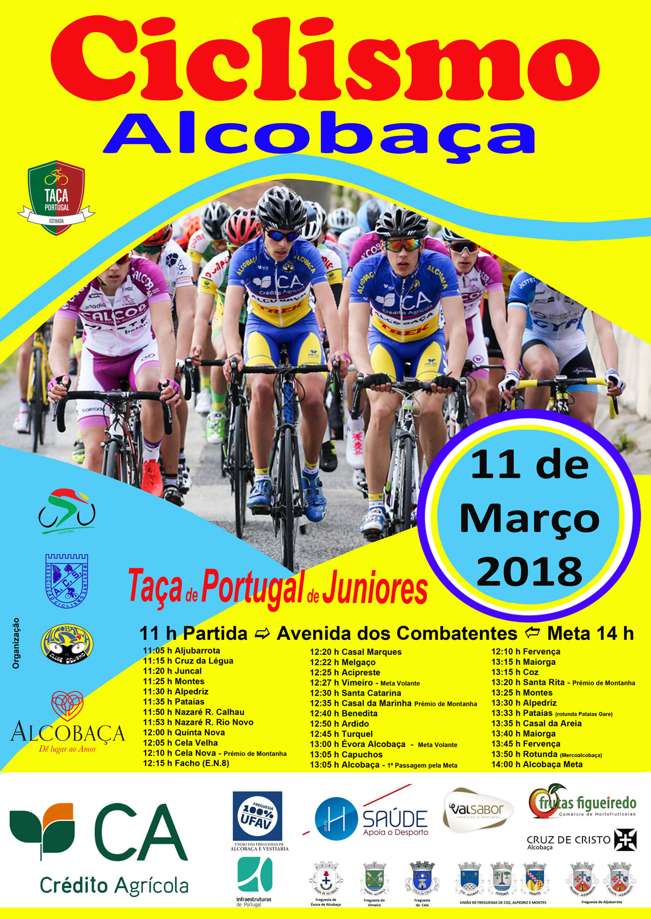 Alcobaça vai acolher neste domingo, dia 11 de Março, a 1ª Prova da Taça de Portugal de Juniores, um evento da responsabilidade da Federação Portuguesa de Ciclismo que confiou a organização da prova ao Alcobaça Clube de Ciclismo. A prova terá partida pelas 11:00 horas na Avenida dos Combatentes, em Alcobaça, e os cerca de 150 jovens corredores, de cerca de vinte equipas, terão pela frente um percurso de 112 quilómetros, que incluiu passagens por Aljubarrota, Cruz da Légua, Juncal, Pataias, Nazaré, Cela Velha, Vimeiro, Santa Catarina, Benedita, Évora, Maiorga, Montes e regresso a Alcobaça onde a prova deve terminar pouco depois das 14:00 horas.