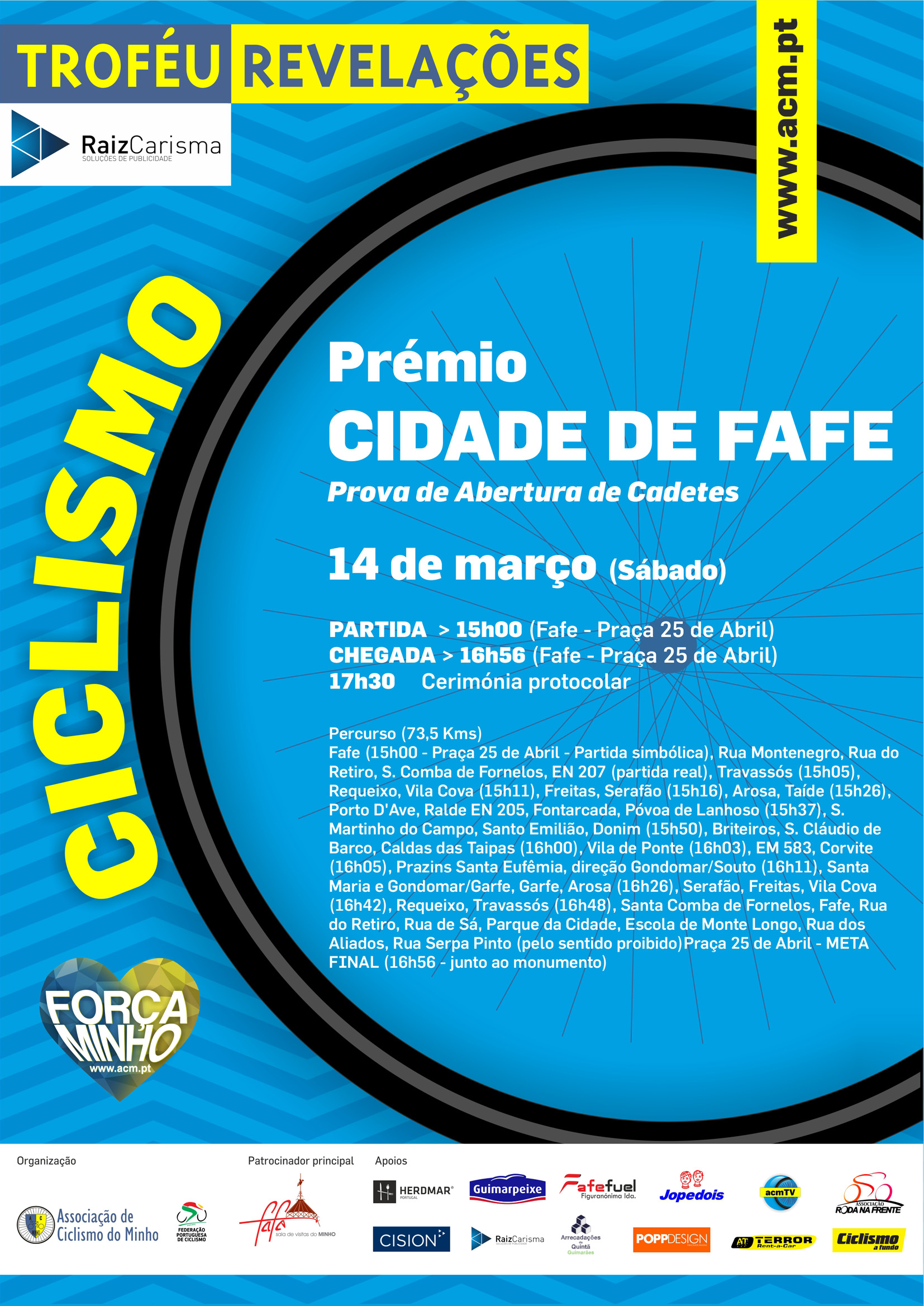 Além do Prémio Cidade de Fafe – Cadetes (Prova de Abertura de Cadetes- Zona A / Troféu Revelações Estrada – Raiz Carisma), o concelho de Fafe acolherá este ano a Taça Portugal – Juniores – Liberty Seguros (Prémio de Freguesia de Golães / Troféu José Martins no dia 9 de maio), o Prémio Festas da Cidade de Fafe (11 de julho), o Prémio Fafe – Sala de Visitas do Minho (12 de setembro) e ainda o 1º BTT DHI Freguesia de Armil (8 de março) atividades apoiadas, como habitualmente, pela Câmara Municipal de Fafe. O concelho fafense assumirá ainda destaque na edição deste ano da Volta a Portugal em Bicicleta.