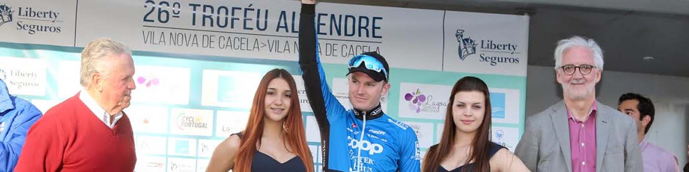 O norueguês Jensen August (Team Coop-Oster Hus) é o primeiro camisola amarela do Grande Prémio Liberty Seguros, graças ao triiunfo, hoje, em Vila Nova de Cacela, na Clássica do Restaurante Alpendre, primeira etapa da competição, que teve o presidente da União Ciclista Internacional (UCI), Brian Cookson, como um dos espectadores.